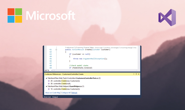 O Microsoft Visual Studio Pro 2019 fornece recursos poderosos para entender rapidamente seu código. O Code Lens ajuda você a manter o foco no seu trabalho exibindo referências de código, fazendo alterações em seu código, indicando quem foi o último a alterar o método ou verificando se os testes foram bem-sucedidos, tudo no código de seu código.